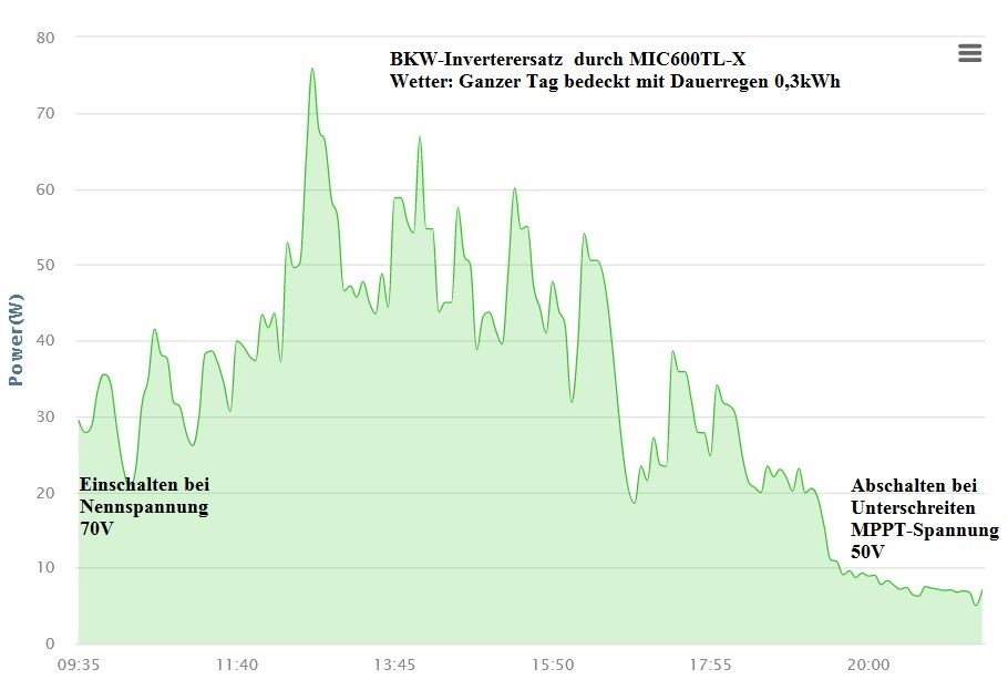 Der Wechselrichter schaltete sehr spät ein. Das Kriterium ist die Überschreitung von 70V unter der Last des Eigenverbrauchs inklusive herausnehmbaren WLAN- Modul mit 5V und 1A, was in meinen Augen sehr viel ist. Der Tagesertrag war nur 0,3 kWh von möglichen 4kWh. In den drei Hochwintermonaten reduziert sich das erfahrungsgemäss (Statistiken liegen seit 1995 vor) abermals auf 10%. Jeder kann sich ausrechnen, ob er damit eine Luftwärmepumpe sinnvoll betreiben kann. Die optimale Elevation der Solarmodule für diese spezielle Anwendung wäre übrigens der Breitengrad des Betriebsortes plus 20 Grad.
