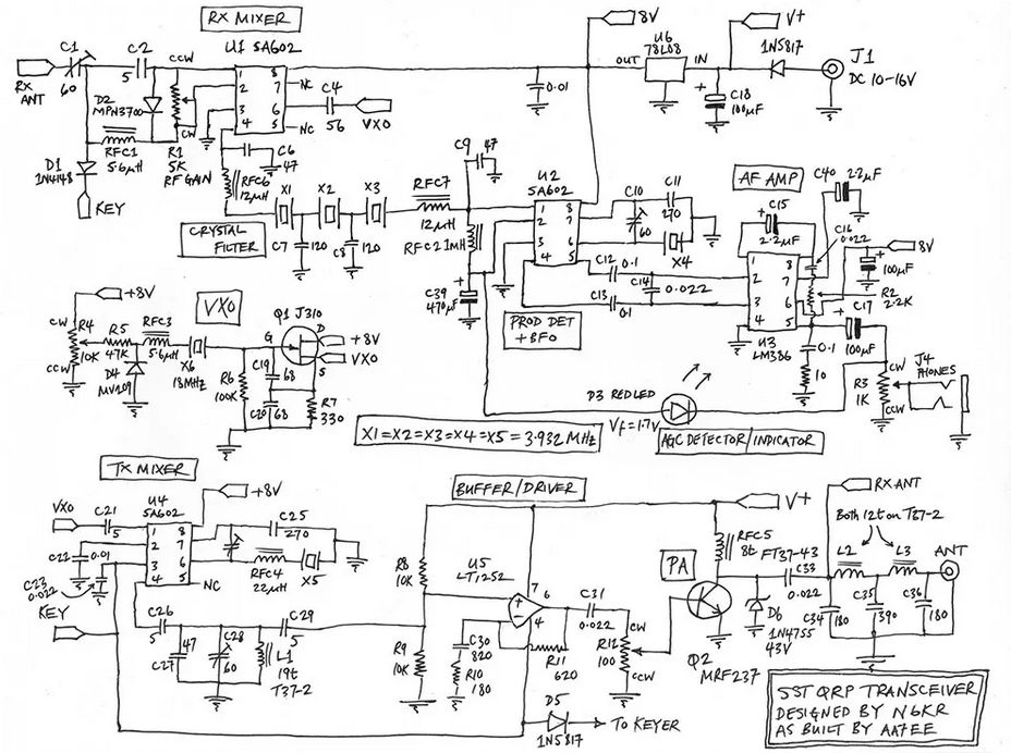 Der Transceiverbausatz enthält ca. 60 Bauelemente und ist ein Minimalkonzept. Der dreistufige Quarzsender wird im Takte der Morsezeichen um 700 Hz geshiftet, damit sich im Empfänger (Gilbertzelle SA612 OPV MC1458) die gleich hohe Tonfrequenz ergibt.