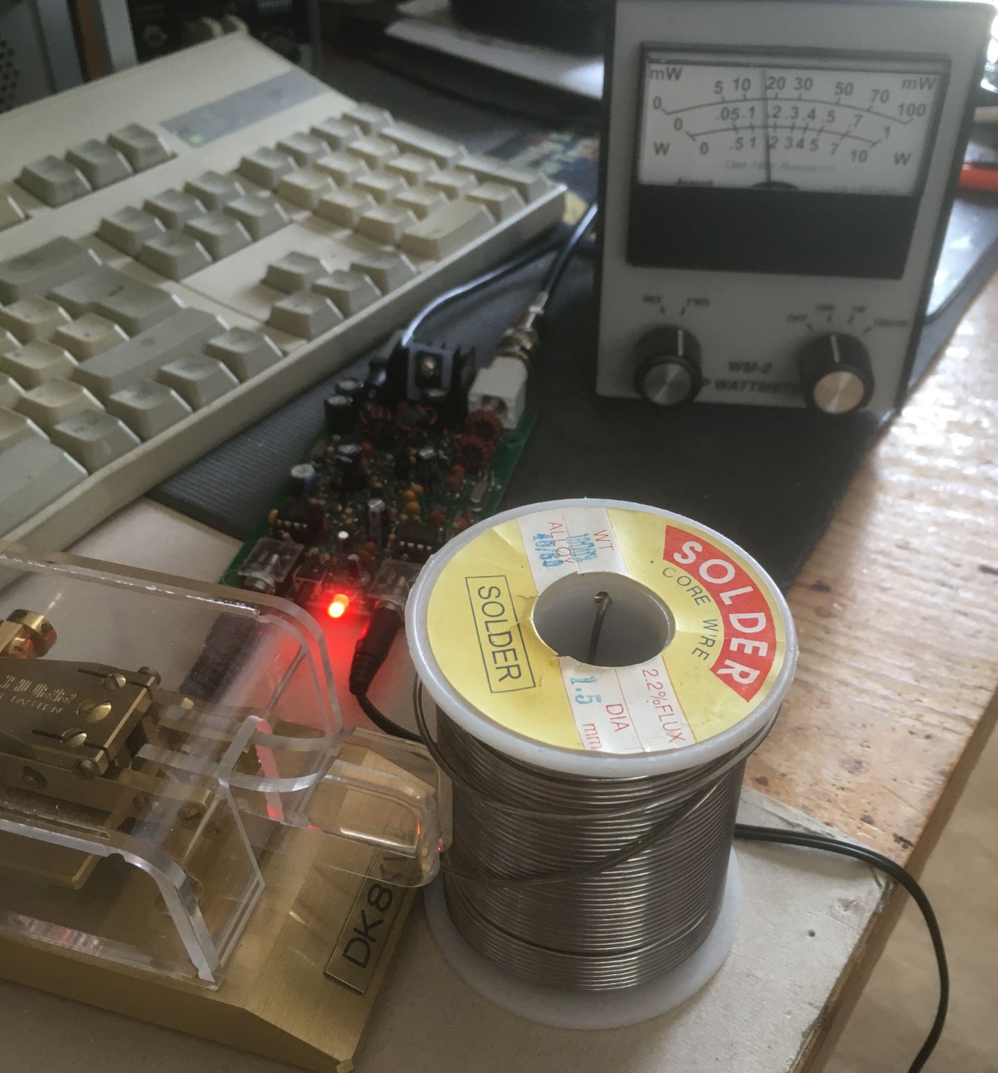 das 15-Euro Platinchen aus China ist zusammengelötet und funktioniert gut. Der Mikrocontroller PIC 12F629 ist geschützt und nicht kopierbar, was bei dem Preis des gesamten Bausatzes nicht stört. In der Tonaufnahme kann man die Tastgeschwindigkeit nach dem Initialisieren ohne eine Änderung hören. Nach Anschluss an den Dipol waren ohne grosse Wartezeit 3 Stationen aus Holland, Deutschland und der Tschechei zu hören. Der Keyer scheint eine IAMBIC-Funktion aktiviert zu haben, was mir sehr gut gefällt. Die Leistung liegt im einstelligen Wattbereich, beim Senden von Dauerstrichen schlug das stark gedämpfte Instrument auf mehr als 2 Watt aus. Wie sich später heraus- stellte 3 Watt bei Dauerstrich und 14 Watt Input. Der Wirkungsgrad der chinesischen Eintakt-Endstufe ist also unterirdisch.Sollte mir ein passendes Gehäuse zulaufen, werde ich das Platinchen einbauen und ein paar Funkver- bindungen machen.