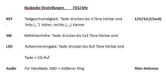 seit drei Jahrzehnten gibt es jetzt schon den "Rockmite" von Dave Benson K1SWL in drei Versionen für 80, 40 und 20m. Dies ist ein Telegrafie- Transceiver mit einer Sendeleistung von ca. 1W, der zumeist auf der QRP-Quarzfrequenz nach dem aktuellen Bandplan betrieben wird.