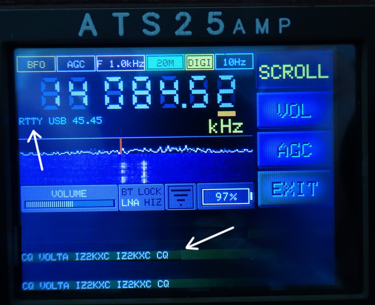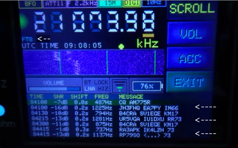 weiter geht es: Der ATS-25AMP kann u.a. auch die digitale Betriebsart FT4, FT8. (RTTY, Hell)) dekodieren. Hier ein FT8-Beispiel auf 21074 KHz mit Anzeige es "Wasserfall"-Diagramms. Im unteren Teil des Displays wird der Ablauf von FT-8 QSOs gezeigt.