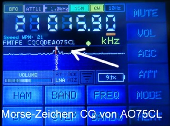 bin dabei eigene Erfahrungen mit dem ATS-25AMP HAM zu sammeln. Hier schon mal ein kleiner Spoiler in Form eines Kurzvideos, welches die Dekodierung von AFU-CW Zeichen darstellt. In der Zeile unter die Frequenzanzeige ist die Morse-Laufschrift zu sehen.
