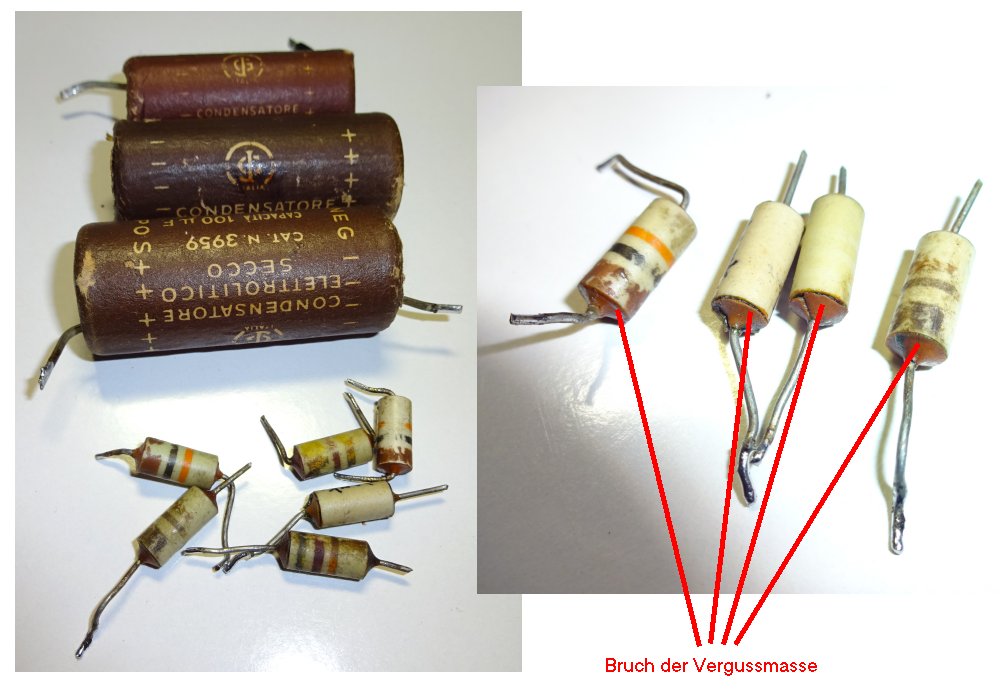 Die potentiell gefährlichen Elektrolytkondensatoren und alle Widerstände der Bandbreiteneinstellung des Quarzfilters, die sich bei der Sichtprüfung als beschädigt erwiesen, habe ich ersetzt. Diese Widerstände waren wohl schon früh ausgefallen, da sie offensichtlich unter unzulässig hoher mechanischer Spannung eingebaut worden waren.