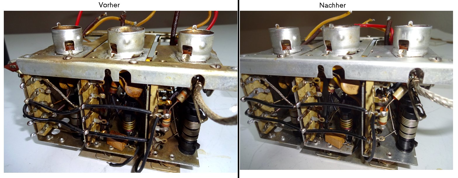 Die Drehschalter, aus meiner Sicht die kritischsten Bauteile, funktionieren, bis auf eine Ausnahme, einwandfrei. Ausgerechnet der tief im Inneren des HF-Moduls verbaute Bereichsschalter hatte in zwei Stellungen Durchgänge, die im Schaltplan nicht vorgesehen sind. Also habe ich das HF-Modul ausgebaut und einer separaten Intensivwäsche und darauf folgender scharfer Trocknung unterzogen. Ob es etwas gebracht hat - das wird sich zeigen.