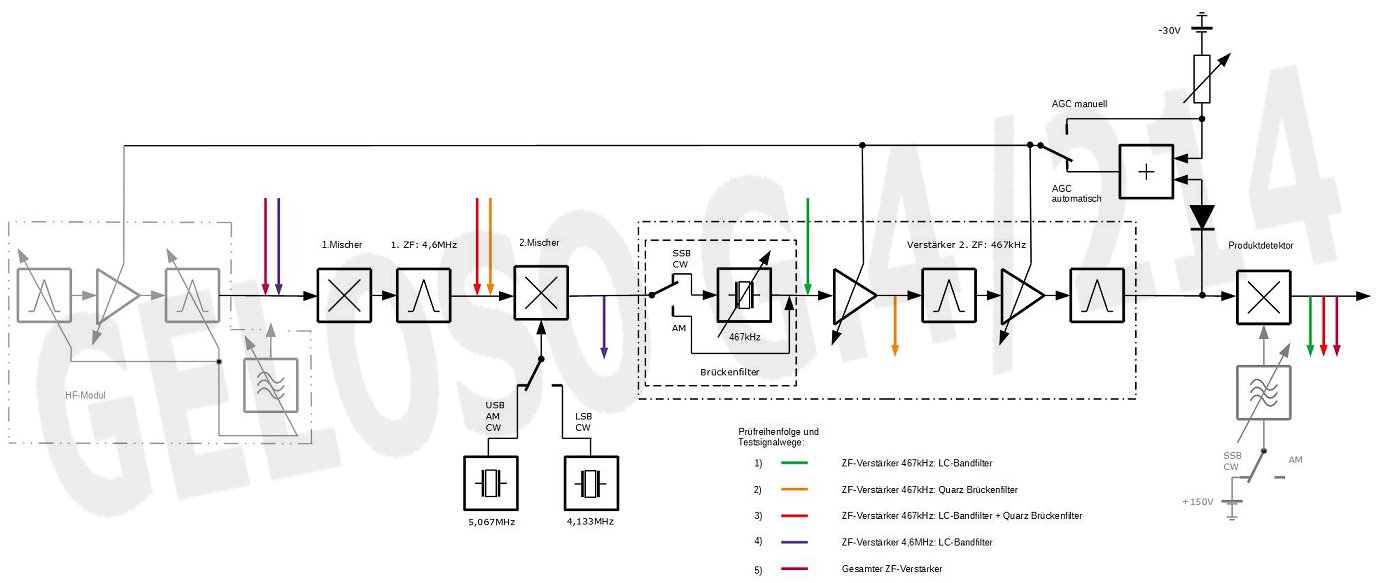 im Zuge der weiteren Inbetriebnahme des Empfängers habe ich den ZF-Vertärker überprüft. Der G4./214 ist als Doppelsuper konzipiert, dh das Empfangssingnal wird auf zwei unterschiedliche Zwischenfrequenzen umgesetzt, was bei der Prüfung berücksichtig werden muß. Ich habe mit dem niederfrequenten Teilverstärker(467kHz) begonnen und den Abgleich mit dem höherfrequenten Verstärker(4,6MHz) abgeschlossen. Ein stark vereinfachtes Blockschaltbild soll die Vorgehensweise verdeutlichen.