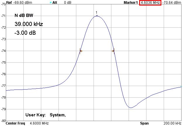 In der folgenden Aufnahme ist die Übertragungskurve des 467kHz-Verstärkers ohne Quarzfilter, links wie vorgefunden, rechts nach Neuabgleich, abgebildet. Die linke Kurve zeigt, dass die maximale Amplitude außerhalb der Nennfrequenz(467kHz) liegt und dass die gesamte Kurve zu höheren Frequenzen verschoben ist, wodurch die besonderen Eigenschaften des Quarz-(Brücken)Filters nicht zur Geltung kommen. Vermutlich wurde dieser Verstärkerteil irgendwann nach der in der Abgleichanleitung des Empfängers beschriebenen Methode(Maximalanzeige des S-Meters) überarbeitet. Beim Neuabgleich konnte die symmetrische, um die Nennfrequenz zentrierte Übertragungsfunktion leicht überkritisch gekoppelter Bandfilter erzielt werden.