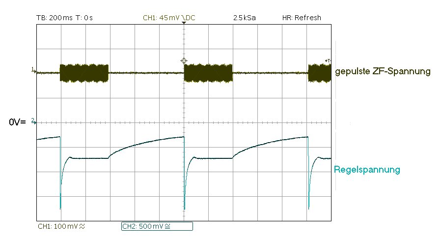 Der bis hierher beschriebene Abgleich wurde mit fest eingestellter Verstärkungsregelung(Handregelung) durchgeführt. Der Verlauf der Regelspannung bei aktivierter automatischer Regelung ist unten dargestellt. Der starke (negative) Überschwinger der Regelspannung zu Impulsbeginn ist den Testbedingungen zuzuschreiben. Diese Situation würde im Normalbetrieb wohl nur selten eintreten und falls doch schneidet der eingebaute "Krachtöter" die Impulsspitze auf der NF-Ebene ab. Bemerkenswert ist das Abklingverhalten der Regelspannung: Er entspricht dem Umladevorgang eines einfachen RC-Gliedes, dh heißt, der Empfänger wird wohl im Betrieb "atmen", da keine Massnahmen getroffen sind (ich kann jedenfalls keine erkennen), die auf die besonderen Empfangsbedingungen des Amateurfunks eingehen.
