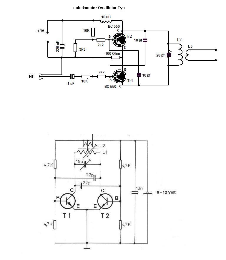 Kann mir jemand mit technischen Informationen zu diesem Oszillator Typ weiterhelfen, ich habe mal den Schaltplan beigefügt. Dazu noch das sicherlich bekanntere Schaltbild eines Gegentaktoszillators.