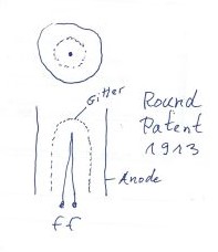 Bei Eisenbarth fand ich für Round/Marconi nur das Patent GB13274 von 1914. Hier war die Anode eine Platte, die Röhre eigeschnürt und mit einem Aussengitter versehen "Improvements in or relating to vacuos tubes used as magnifiers of continious electrical oscillations".