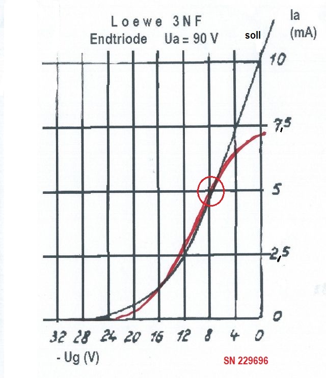 Was sofort auffällt, der Riesenunterschied im Anodenstrom (rot), welcher 3x größer als die Vorgabe (schwarz) ist !! Weiterhin erkennt man, dass der Ia nicht zu Null geht. Es bleibt ein gewisser „Schwanzstrom“, auch bei einer hohen -Ug. Darf ich andere Besitzer (Walter z.B.) einer 3NF bitten, meine Messungen zu wiederholen und bekannt zu machen. Herr G. Eisenbarth weist in seinem Buch „Die Loewe Mehrfachröhren“ (Seite 2.36) auf eine Verbesserung des 1. Systems während der Produktion hin.