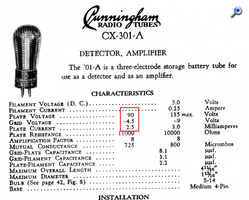 1: Cunningham: CX301A f=5v Vg=-4.5 v Ia= 1mA Ua=90v Vac.test = OK.