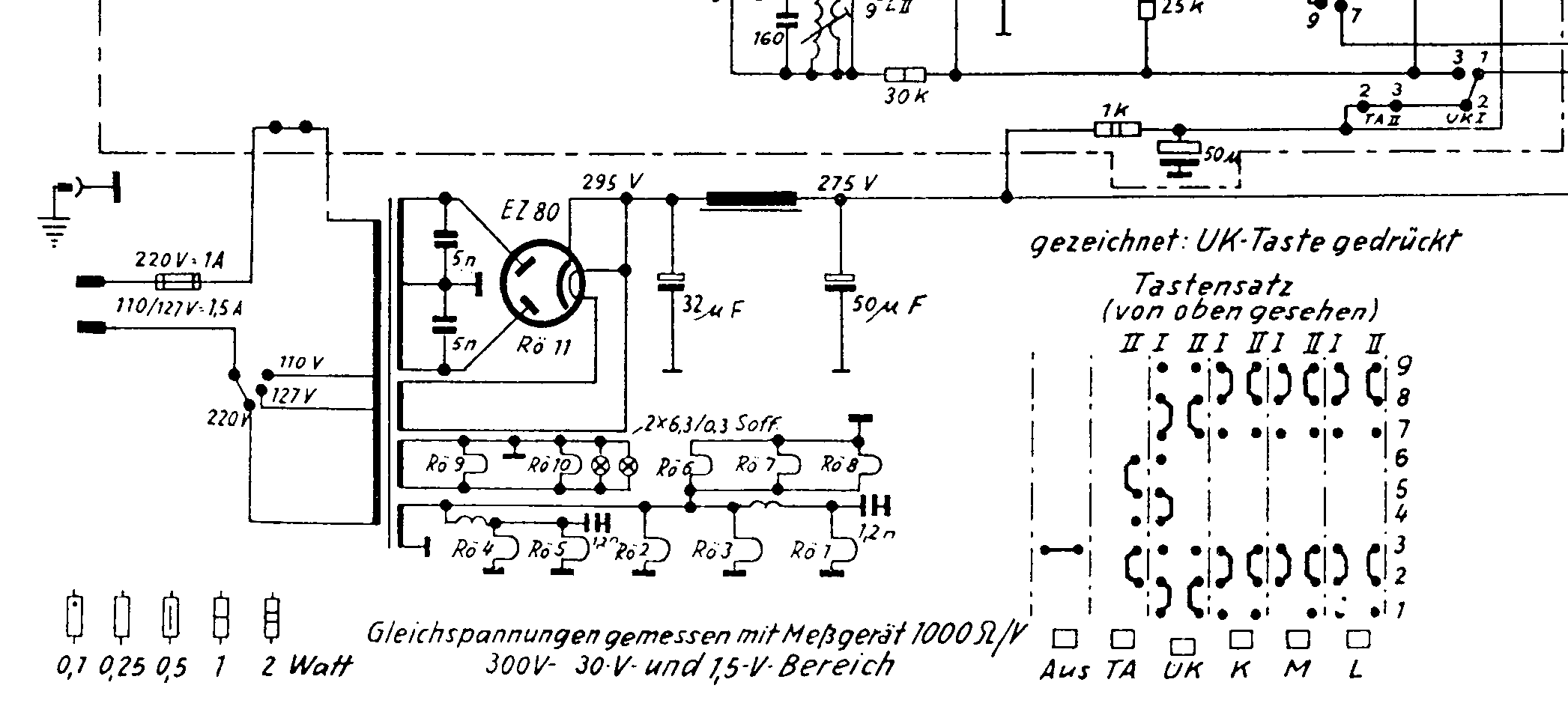 Die Anode EBF 80 hat 295 V bei betätigter UKW-Taste und 283 V bei betätigter MW-Taste. (lt. Schaltplan 250V)