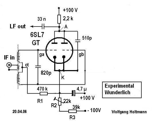interessante Röhre! Die Schaltung kann man aber auch mit einer normalen Doppeltriode machen, wie ich in meinem Stereo-Dekoder gemacht habe (siehe Beschaltung ECC91 in http://www.wumpus-gollum-forum.de/forum/...der-58_253.html). Dort wird zwar nicht ein AM-Signal demoduliert, aber die HF-Zweiweg-Gleichrichtung zur Gewinnung einer Richtspannung als der eine Zweck sowie die Frequenzverdoppelung durch die hier gewollte Verzerrung durch massive Übersteuerung. Wäre noch eine Anwendung für die Wunderlich-Röhre als wohl exklusivsten Stereo-Dekoder...