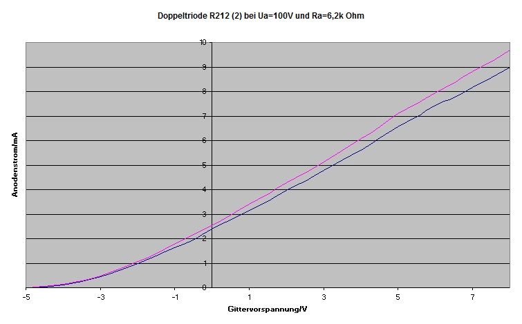 die R212 Röhren sind bei mir angekommen, und ich habe sie sofort in den Röhrentester gesteckt und exemplarisch ein Kennlinienpaar (2) aufgenommen. Das statische Durchfahren im positiven Gitterstromgebiet darf die zulässige Gitterverlustleistung, deren zulässige Höhe ich nicht kenne, nicht überschreiten. Ich habe daher bei einem Anodenstrom von 10mA aufgehört (Ua=100V, Abschluss mit 6,2kOhm).