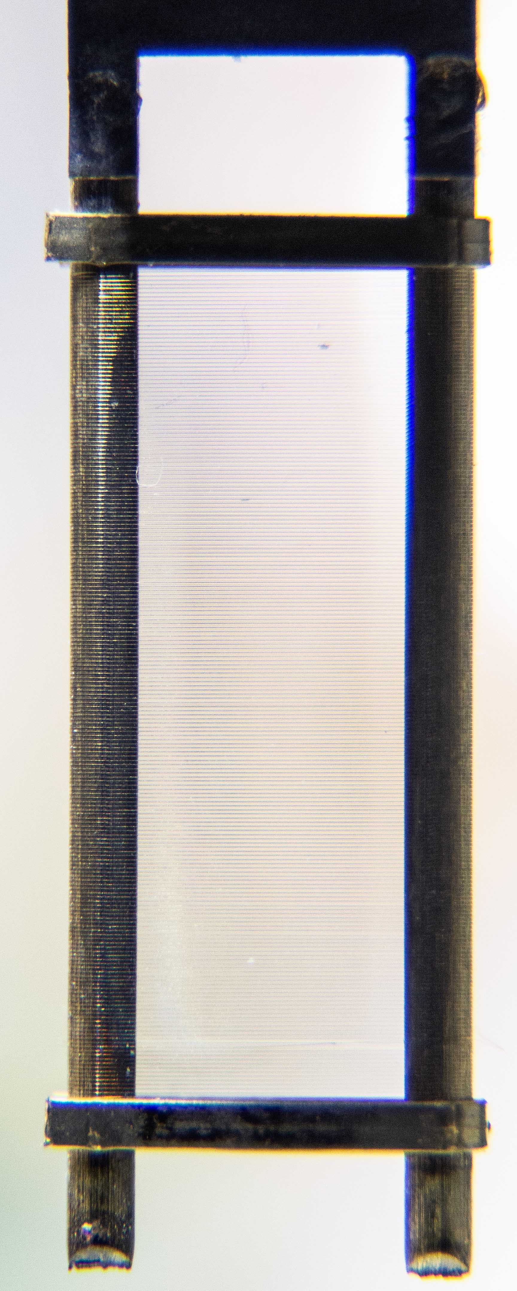 mein Kollege hat seinen ganzen "Maschinenpark" aufgefahren, so ist noch dieses Foto vom Spanngitter entstanden, auf dem Details sichtbar werden (und auch der Staub, der sich an den Drähten festgesetzt hat). Da es nicht perfekt ausgerichtet ist, ist nicht die gesamte Bildfläche scharf, auch vom Objektiv wurde alles verlangt. So als Anhaltspunkt: Die Gitterdrähte haben einen Durchmesser von ca. 8 Mikrometer, das sind etwa 15 Wellenlängen von grünem Licht.