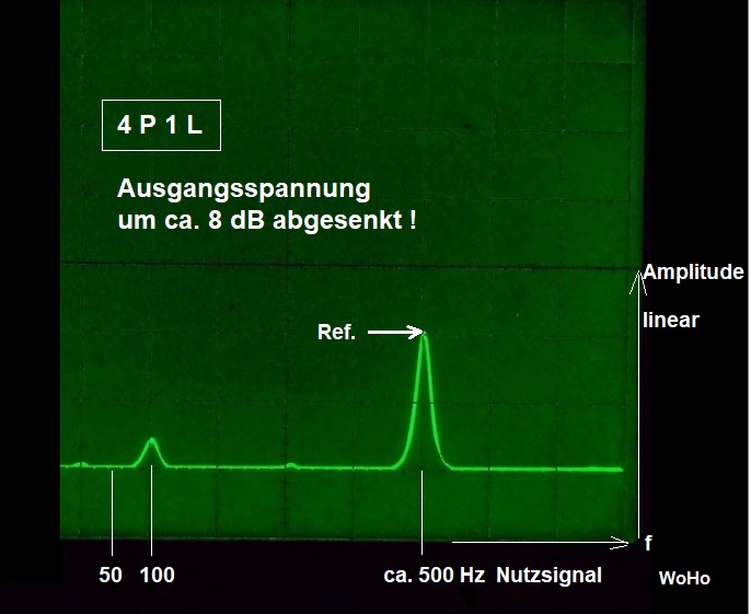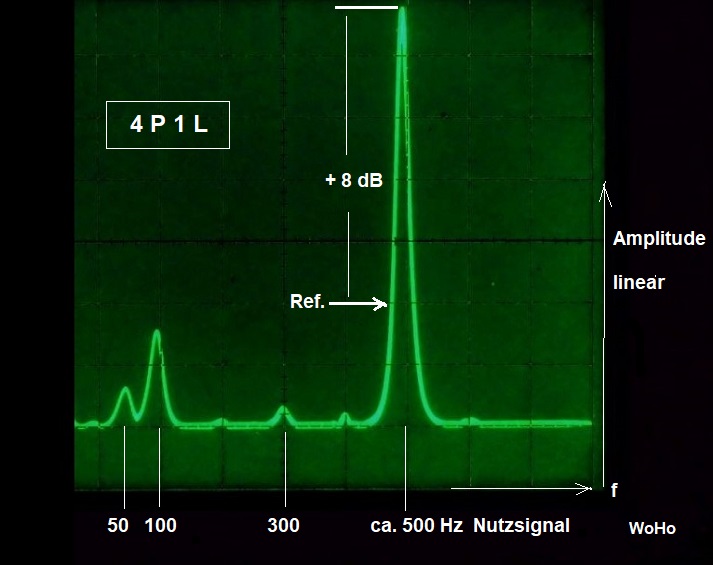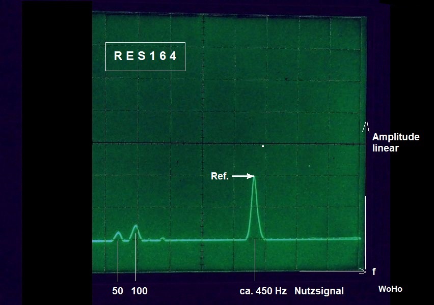 Bisher wurde hauptsächlich mit dem Gehör (und Oszilloskop) die Unterdrückung des ungewünschten Restbrummens beurteilt. Mit dem mir zu Verfügung stehenden Spectrum-Analyzer Tek 5L4N habe ich einen anderen Blick auf die Fragestellung „Womit ist die RES164 zu ersetzen?“ bekommen. Hiermit lässt sich die frequenzmäßige Aufteilung der einzelnen Komponenten sehr schön darstellen.