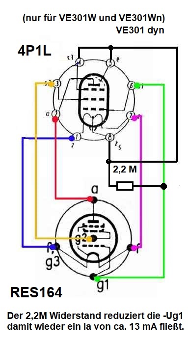 Um die -Ug1 zu reduzieren wurde jetzt jeweils 2,2M vom g1 zu den Fadenenden gelötet. Das hat dann geholfen, den Anodenstrom auf den normalen Wert von 13mA zu bringen. Es ist also ein Spannungsteiler, wobei sich ein Teil außerhalb der Röhre befindet. Das geht für den VE301W und VE301Wn. Damit bin ich zufrieden. Für eine universelle Anwendung des RES164 Ersatzes muss man wohl aufpassen.....
