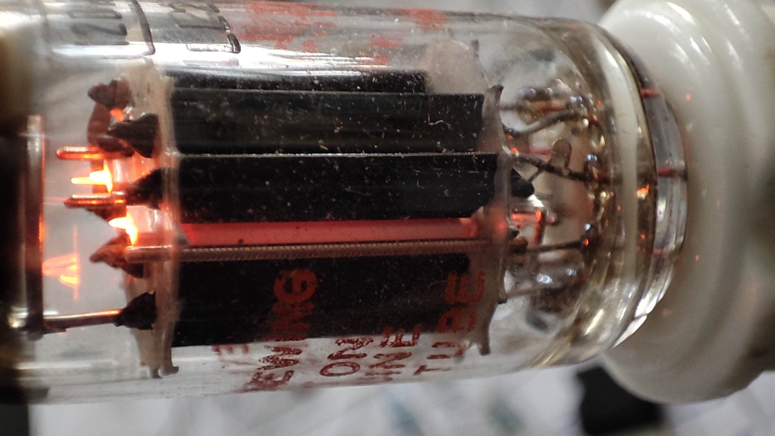 als Nachtrag noch drei Fotos mit glühender Kathode von der 12DW8. Diese Röhre hat zwei NF-Trioden und eine Diode. Die Triode 1 hat mit der Diode eine gemeinsame Kathode. Gelöst wurde dies ganz raffiniert. Die eine Seite der Kathode gehört mit dem Steuergitter, das ebenfalls an den Steugitterstäben einseitig ist und einem Anodenblech zur Triode.