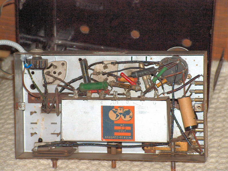 So kommt man von einem angedachten Röhrenthread zu einer Gerätebetrachtung, aber irgendwie gehört das ja zusammen. Als ich das Gerät sah, habe ich nicht sofort an ein Einzelstück, sondern mehr an eine Zwischenlösung VE301W zu VE301Wn gedacht. Erst die nähere Betrachtung ergab einen Umbau etwa Anfang der fünfziger Jahre. Im Anhang die Ansichten des Chassis. Zu dem Netztrafo brauche ich wohl nichts zu sagen. Er hat mir viel Freude bereitet, es lebe die Handarbeit.