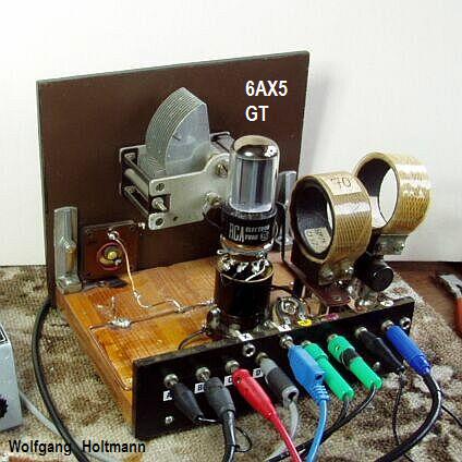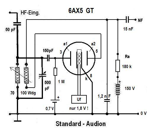 Ausgangspunkt war die Zweiplattenröhre, womit De Forest seine frühen Versuche machte. Also noch ohne Steuergitter..... Es ist die 6AX5GT als rückgekoppeltes Audion. Und es hat funktioniert!