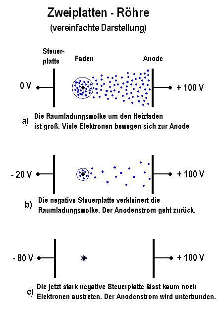 Zitieren:"Es überrascht bei dieser Anordnung zunächst, daß man den Elektronenstrom vom Heizdraht zur Anode durch eine auf der anderen Seite liegende Platte G vollständig steuern und sogar ganz abdrosseln kann. Man findet oft die Vorstellung vertreten, daß die negativ geladene Platte G die Elektronen vom Heizdraht forttreiben, also den Emissionsstrom zur Platte A vergrößern sollte,76 § 8. Steuerspannung; je stärker negativ sie gemacht würde. Das ist, wie man sieht, gänzlich falsch! Der Strom wird stets um so kleiner, je stärker negativ Ug gemacht wird und hört bald ganz auf." H.Barkhausen, Lehrbuch der Elektronenröhren, 1931 Bd1 s 76