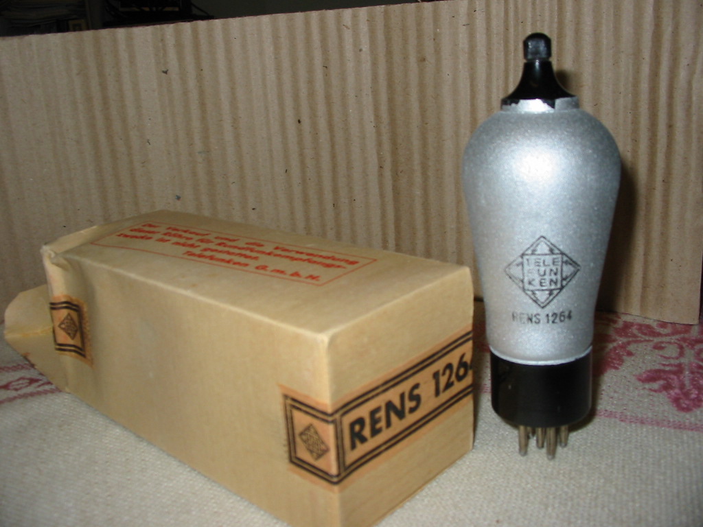 eher schlicht kommt eine Röhrenschachtel von Telefunken für eine RENS1264 daher. Diese Röhre ist eine der ersten Schirmgitterröhren aus dem Jahr 1931 überhaupt (nach der RENS1204 aus dem Jahr 1928). Sie wurde schnell im Jahr 1933 durch die RENS1284 ersetzt, die eigentlich schon eine Penthode war, obwohl Telefunken lange im Konflikt mit Philips (H4128D, E446) sie auch als Schirmgitter Röhre anbot.