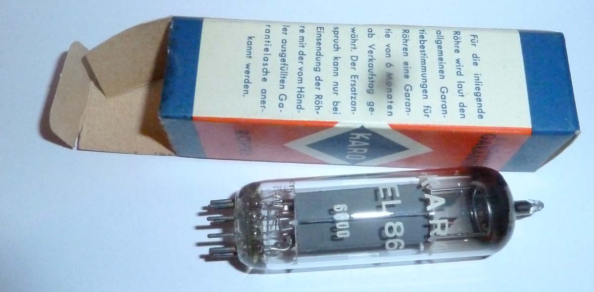 ich habe da noch eine EL86 von Karo für deine Sammlung gefunden. Wo der Hersteller beheimatet ist, weiss ich nicht, aber er scheint im deutschsprachigen Raum zu sein. Vermutlich sind die Röhren nur umbenannt.