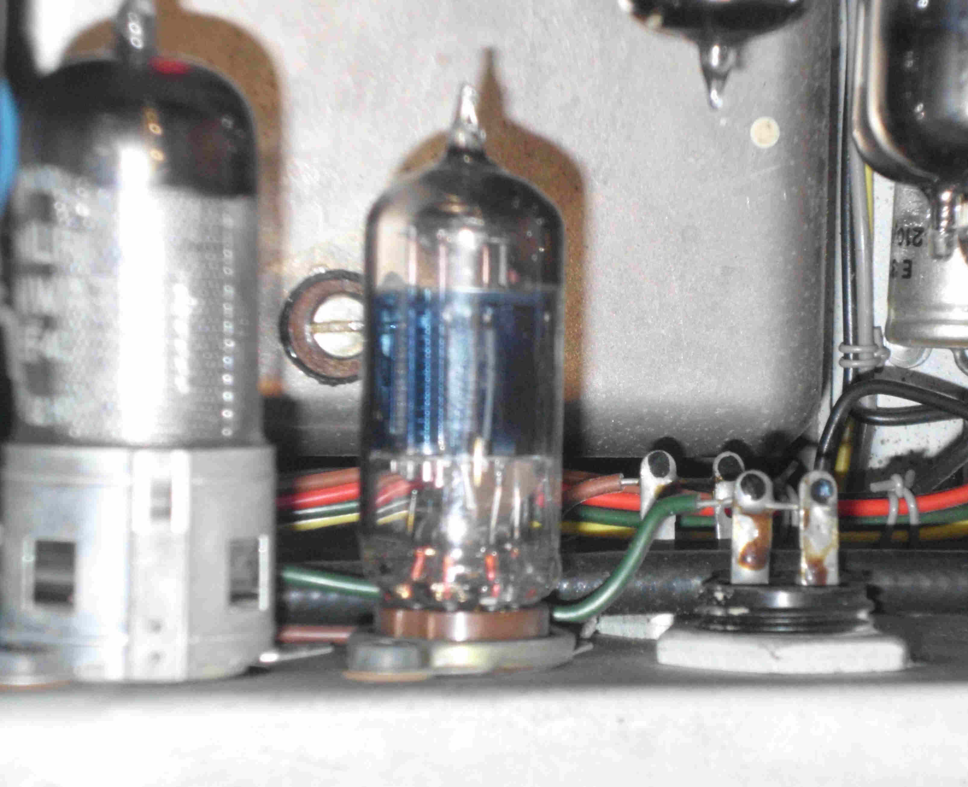 Moin, ich möchte diesen Faden noch mal aufgreifen. Ich bin zur Zeit in Zeitabständen an einem Philips Röhrenvoltmeter PM6017 dran. Das RVM tut wieder was es soll. Nur der Phasenschieber-Kalibrierspannungsgenerator will noch nicht. In diesem Gerät steckt eine EF91 mit teilweise blauem Kolben. Der Grund dieser Färbung ist mir rätselhaft. Als Anhang 3 Bilder der Röhre.