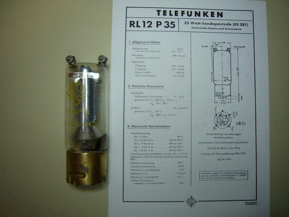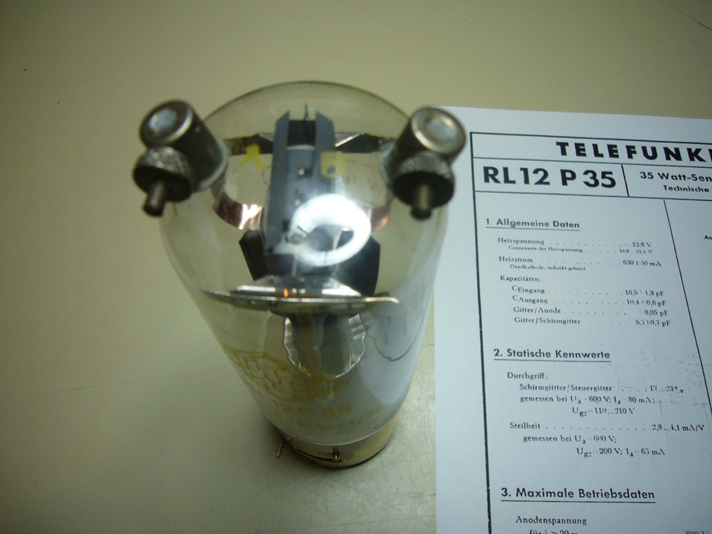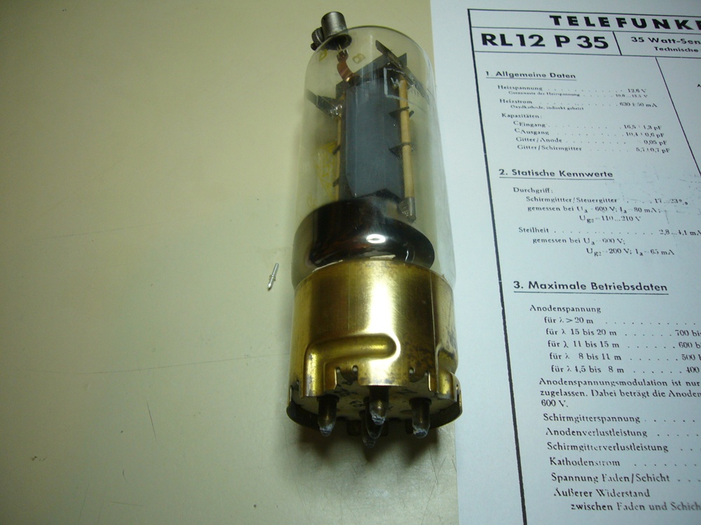 Da hast Du echt großes Glück gehabt. So eine RL12P35 habe ich auch, ebenfalls als Ex-Wehrmachtsröhre. Das einzige, aber nicht unlösbare Problem, ist die fehlende Fassung. Diese werden öfter auch in der "Bucht" für mehr als 20 Euro angeboten. Einfach "Nepp". So kann man die Röhre alternativ über eine Schelle mit Standfuß anbringen und die Anschlüsse am Sockel unter entsprechender Vorsicht direkt anlöten. Toll finde ich an ihr die beiden Kappenanschlüsse oder auch "Hörner", mit etwas Phantasie. Ich wünsche Dir mit dem schönen "Stück" viel Freude und den gewünschten Erfolg.