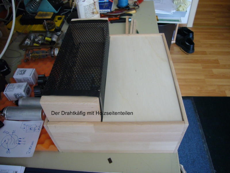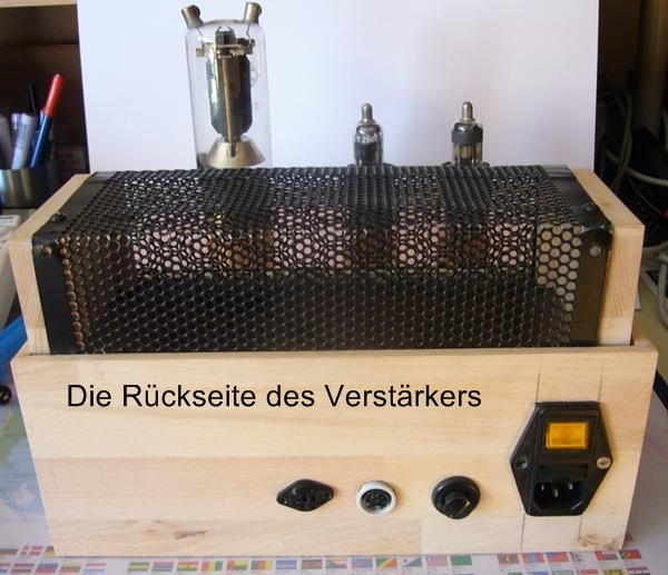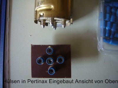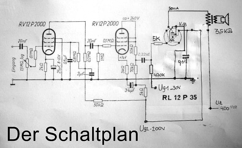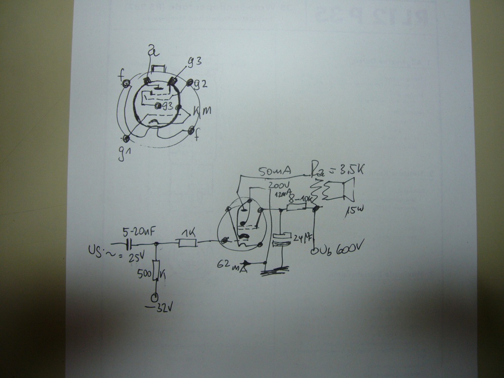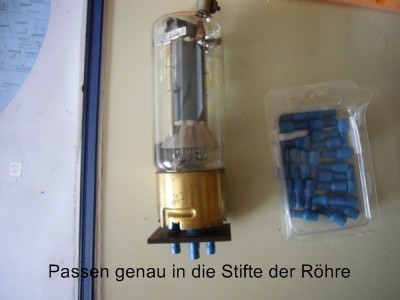 Wenn eine Fassung nicht verfügbar ist, oder zu teuer, hier ein Basteltipp: Ich hatte ein Stück Pertinax übrig.(Rund wäre schöner gewesen) In diesem habe ich die Löcher mittig zu den Kontakten der Röhre mit einem 8- mm-Bohrer gebohrt. In die Löcher kommen Kabelverbinder/Rundsteckhülsen. Diese haben einen Schlitz, sodass die Röhrenstifte Perfekt hineinpassen und einen sehr guten Kontakt bilden. Der nächste Schritt ist das Versorgungsnetzteil mit Ua 400 V, Ug2 200 Volt und Ug1 wird über ein Poti auf ca. 63 V eingestellt. Alle Röhren benötigen 12,6 V, das ist auf dem Trafo schon berücksichtigt, max. 3 A. Der Probelauf ohne Vorstufe ist gelungen. Kathode, Gitter an Masse, anstelle des 300 R. (Negative Gitterspannung ist ja da.) Ug1 470 k bleibt und 5 k nach dem Nf-Eingang von 0,22 µF. Vom Netzteil aus (Poti) ist die Ug1 auf -30 V eingestellt. Ug2 bekommt beim Einbau des ganzen noch einen 0,1-µF-C mit 500 V gegen Masse. Die RL12P35 nimmt bei 400 Volt 48 mA. Der AÜ sollte nicht mehr als 4 kOhm haben. Der Test verläuft sehr gut mit schönem Klang aus einem Lautsprecher, den ein Radiofreund spendiert hatte. Angeschlossen habe ich einen Plattenspieler. Datenzur Röhre h t t p://www.hts-homepage.de/Wehrmacht/Heer/WMRL12P35.html DIE BLANKEN "HÖRNER" DER RÖHRE = ANODE - SIND (ist) ISOLIERT WORDEN