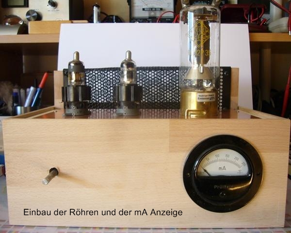 Aus dieser Röhre ist doch noch etwas geworden. Zunächst wurde die Röhre auf einem Neuberger Röhrenprüfer geprüft. (Radiomuseum Linsengericht) Dazu hatte ich noch eine Fassung, die in den Neuberger Eingebaut wurde. Jetzt musste eine andere Fassung für das Projekt her. Ergebniss auf dem Nezuberger RPM 370 ist Emission 67 %, also gut brauchbar.