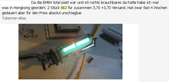 ich möchte eine EM84 durch eine 6E2 ersetzen, weil diese aus chinesischer Produktion sehr günstig zu beschaffen sind. Allerdings soll die 6E2 mit der EM87 identisch sein, welche wiederum mit der EM84 pinkompatibel ist. Laut den Datenblättern sind die Unterschiede zwischen der der EM84 und EM87 gering. Eventuell muss ein Widerstand angepasst werden. Hat jemand damit schon Erfahrungen gesammelt?