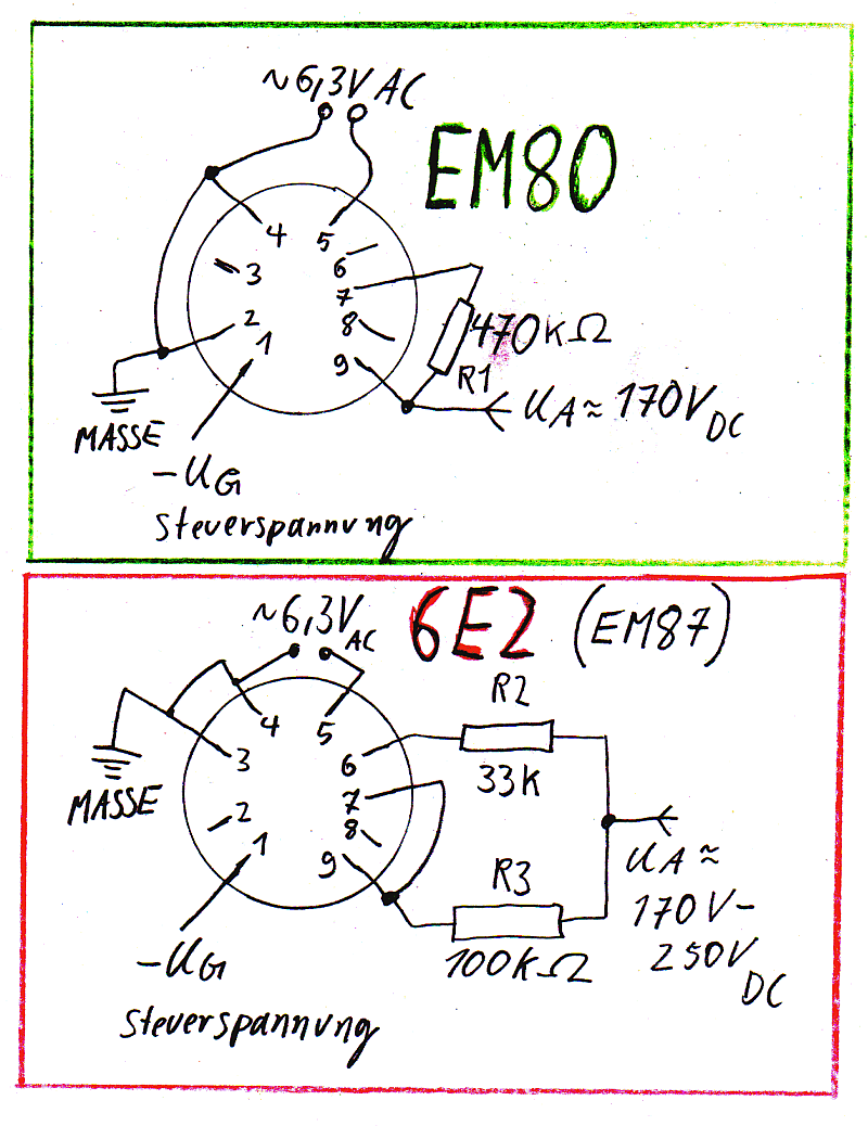 Noch ein Nachtrag: Beim Vergleich der beiden Datenblätter für die EM84 und EM87 (6E2) ist mir aufgefallen, dass es sinnvoll wäre den 570 kOhm-Widerstand am Pin 9 durch 100 kOhm zu ersetzen, wenn die EM84 durch eine 6E2 ersetzt werden sollte.