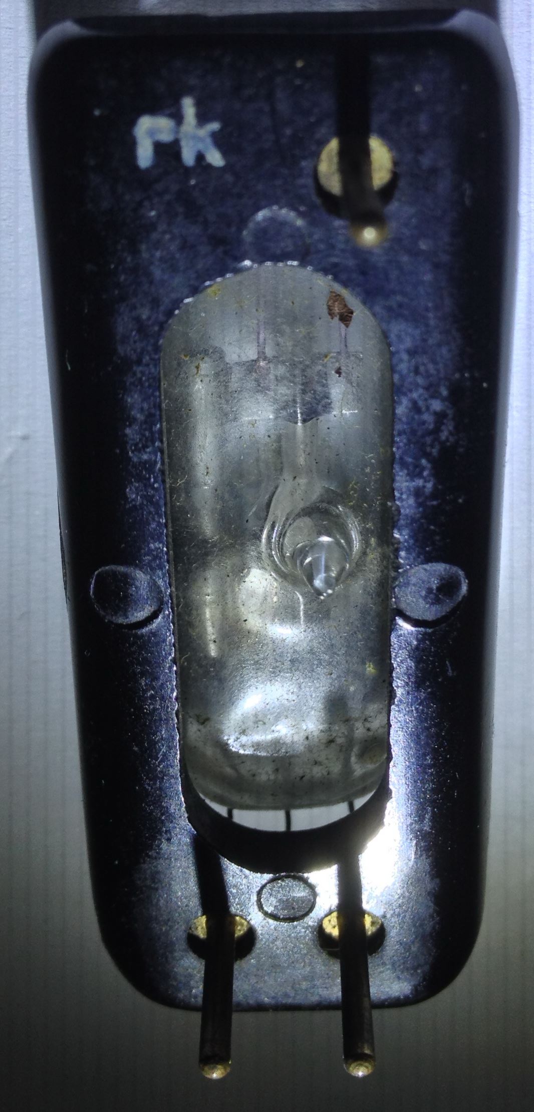 Ich habe mit einem USB Mikroskop die gesamte Oberfläche abgesucht. Mit dem Ding konnte ich den Telefunken Rhombus und die Buchstaben TELEFUNKEN erkennen, aber sonst nix. Einzig unten steht < rk > oder < pk >.