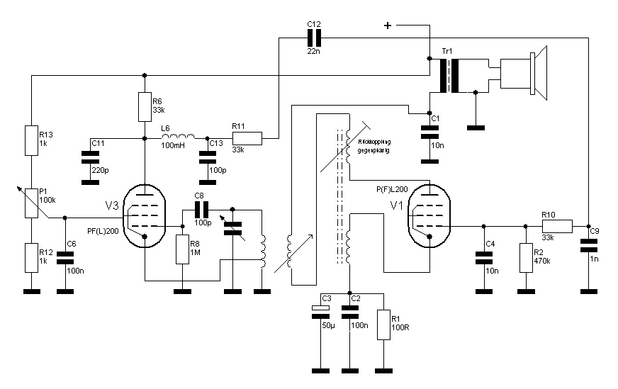 danke für die Rückmeldung. Wie ich sehe, verwendest Du das L-System als Audion und hast die Anode mit 10nF abgeblockt (und somit entschärft), ECO-Rückkopplung sei Dank. Meine Philosophie lautet hier: Bei der Anodenspannung richtig Dampf machen und dafür mit nur einer Röhre auskommen.