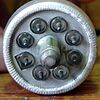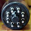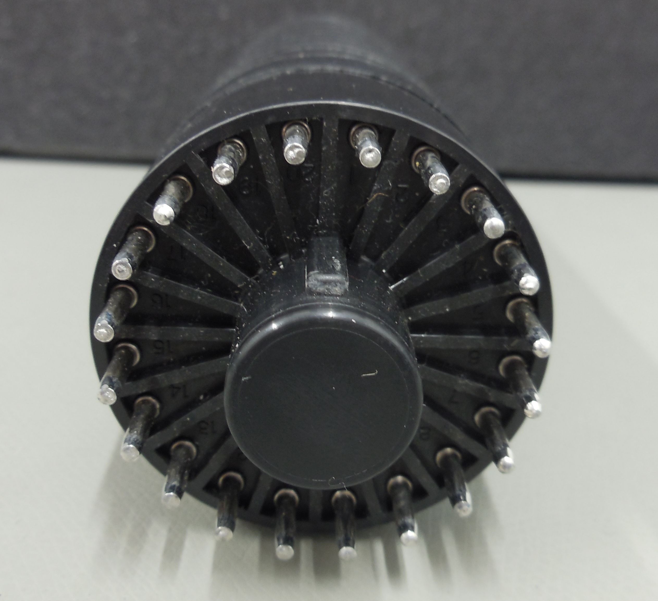 die Anzahl der Anschlüsse ist beim PMT abhängig von der Anzahl der Dynoden. Bei 19 Dynoden, sowie Anode und Photokathode, benötigt man also mindestens 21 Anschlüsse. Habe mal ein Photo von einem 2 Zoll PMT von 1980 gemacht. Hier wurden noch 20 (dicke) Pins verwendet. Später ist man dann bei der teilweise noch höheren Anzahl an Pins, aus Platzgründen, auf Pins übergegangen, wie sie auch z.B. bei der EL84 verwendet werden.