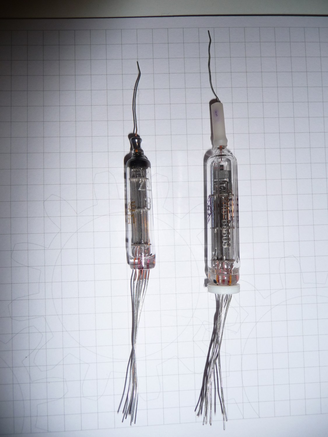 Die linke ist eine 2SH24B, eine HF-Empfängerröhre. Die rechte ist eine 1P24B, auch eine HF-Röhre. Ihre Daten können sich durchaus sehen lassen: Heizspannung 1,2 Volt 255 mA oder 2,4 Volt 128 mA, (Reihen oder Parallelschaltung der Heizfäden), Anodenspannung 150 Volt, Anodenstrom 17 (!) mA, max. Anodenverlustleistung 2,5 Watt.