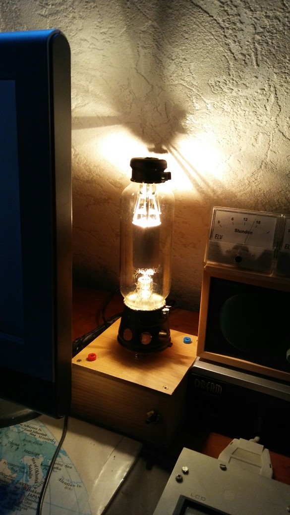 zum Beweis meiner verrückten Taten hier einmal die Telefunken Senderöhre RS31 als Schreibtischlampe. Nun gut, das Lesen bei dem Licht wäre etwas mühsam, aber mit einer Petroleumlampe kann sie mithalten. Es werden im Wolframfaden etwas über 50 Watt umgesetzt, ökologisch natürlich eine Katastrophe.