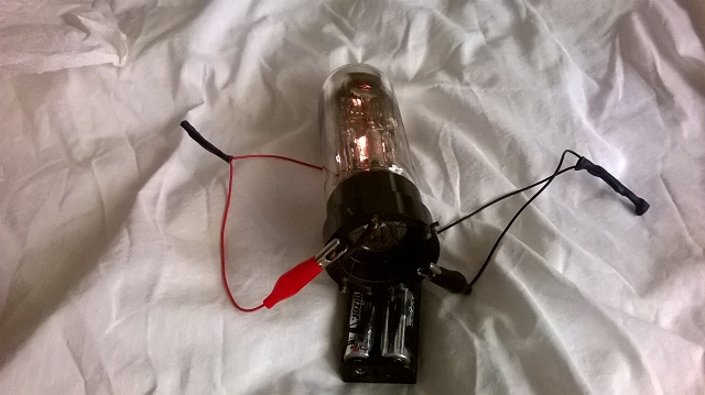 Danke für die Aussage, ich werde es so lassen. Aber die Abschirmung ist nirgends angeschlossen. Es gibt ein anderes Radio was mit solchen Röhren betrieben wird und eine Variante hat zwei Röhren eine 3nf und 3nf w. Anscheinend war in diesem geschlossenen Radio wo man die Röhren bei der Arbeit nicht sehen konnte dieses Notwendig, keine Ahnung was der Graphit Dreck auf der Röhre soll aber egal ich lasse es so und werde die Abschirmung nicht entfernen. Es würde mich trotzdem man interessieren wie du die Röhre ohne Röhren Prüfgerät auf Durchgang testest. Bei den durchsichtigen ist es ja ganz einfach, wenn ich den Sockel vor mir habe und es ist hierbei egal ob der Mittlere Draht vorhanden ist oder nicht müssen die 3 Bayonet Verbindungen ein Ypsilon bilden. Die mittleren beiden Anschlüsse die sich gegenüber stehen sind mit den in Reihe geschalteten 3 Heizfäden verbunden. Zwei ausgelutschte 1,5 Volt Batterien und man sieht schon mal ob alle 3 Heizfäden glühen. Das ist ein hervorragender Schnelltest auf den ich noch nicht mal gekommen bin, warum auch, man braucht immer einen Lehrmeister und ich hatte vor kurzem meinen. Verstehe nur nicht so ganz was du meinst es gibt zwei Varianten der 3nf. Wenn du die 3nf w meinst kannst Du recht haben, aber ich meine die 3nf oder von mir aus auch 3nf Bat, was nichts mit Batterie zutun hat sondern nur mit dem 3ten Kabel was für den Fernempfang vorhanden ist. Bei dieser Variante läuft es immer mit den beiden Anschlüssen in der Mitte. Ich habe bei dem zweiten Foto mal die beiden Kontakte abgeklebt wo ich prüfe. Habe demächst eine Variaten die durchsichtig ist, wenn sich der Verkäufer davon trennt. Konnte diese Röhre aber schon testen. Wie gesagt mit dem Röhrenschnelltest kann man die Heizfäden gut sehen wie sie glühen, wenn einer oder sogar beide nicht mehr funktionieren aber der Heizfaden in der Mitte noch geht dann sieht man nur noch diesen glühen. Jetzt wurde mir auch bewusst warum man mit einem Ohmmeter nichts erreicht und ein Durchgang immer angezeigt wird, auch wenn einige Heizfäden schon durch sind. Nämlich weil diese in Reihe geschaltet sind. Was ich durch meinen guten Bekannten und neuen Freund in der kurzen Zeit gelernt habe ist erstaunlich. OK nur die Emission kann man natürlich mit der Heizprüfung nicht messen aber das ist egal, funktioniert die Heizung kann man schon mal sicher gehen das nix durchgebrannt ist. Habe mich heute wieder mal über eine Aussage geärgert von einem Ebayer der schreibt das er mit dem Ohmmeter die 3nf getestet hat und die Heizung in Ordnung ist. Bis vor kurzem wäre ich noch darauf reingefallen aber jetzt ist die Welt in Ordnung was die 3nf betrifft. Nur bei der 3nf mit Abschirmung sieht es ein wenig schlecht aus, wenn die nicht irgendwelche offenen Stellen am Glas hat kann man die Heizfäden nicht glühen sehen, da braucht es dann schon ein Röhrenprüfgerät.