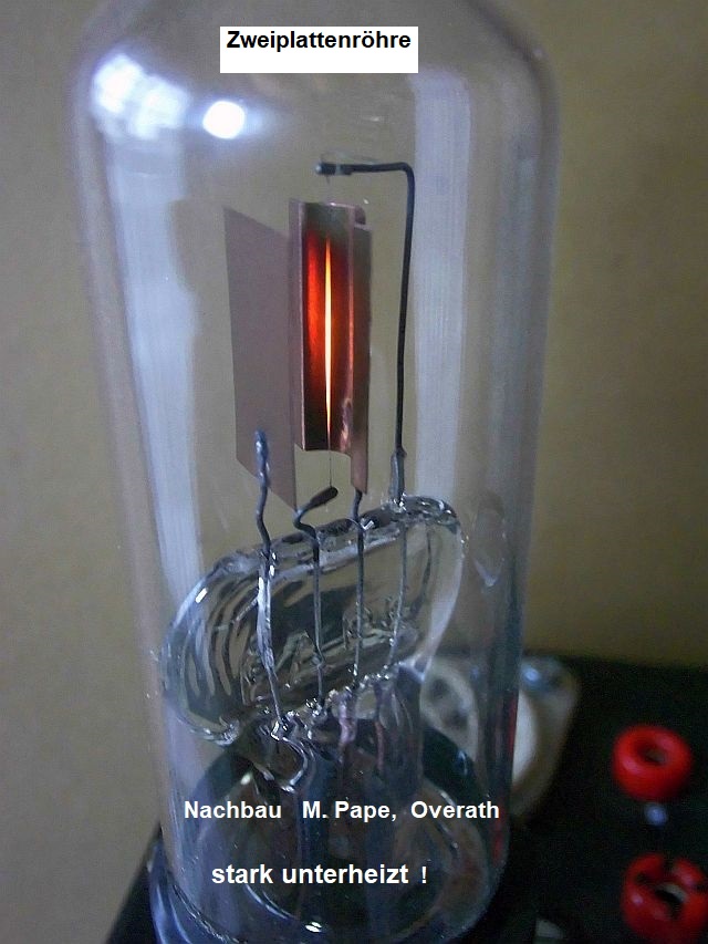 Die „Zweiplattenröhre“ geht auf eine Erfindung von Lee de Forest aus dem Jahr 1906 zurück, wo die Steuerung des Anodenstroms der Triode mit einer Platte auf der a n d e r e n Seite des Heizfadens gemacht wird.