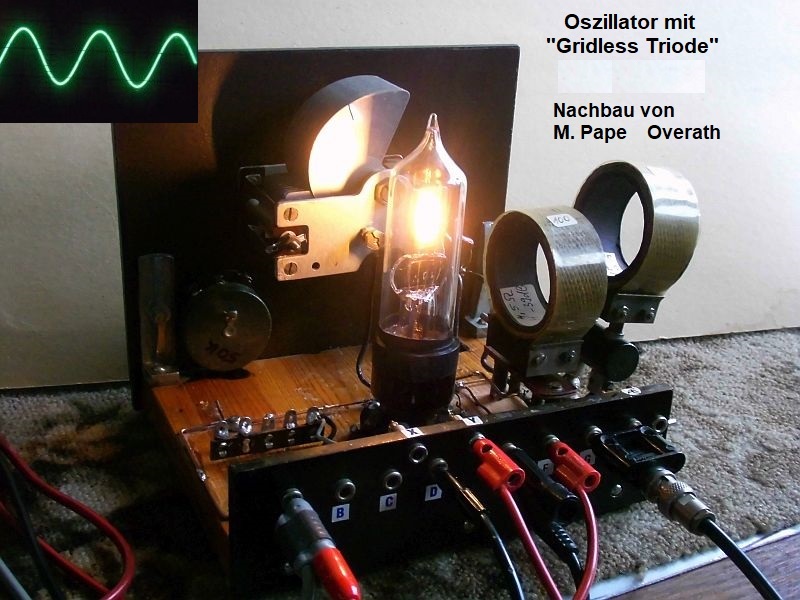 Natürlich wollte ich die Funktion testen mit einer normalen Oszillatorschaltung nach Meißner. Die Anodenspannung beträgt 55V und die Uf ca. 3,5V bei If = 0,65A
