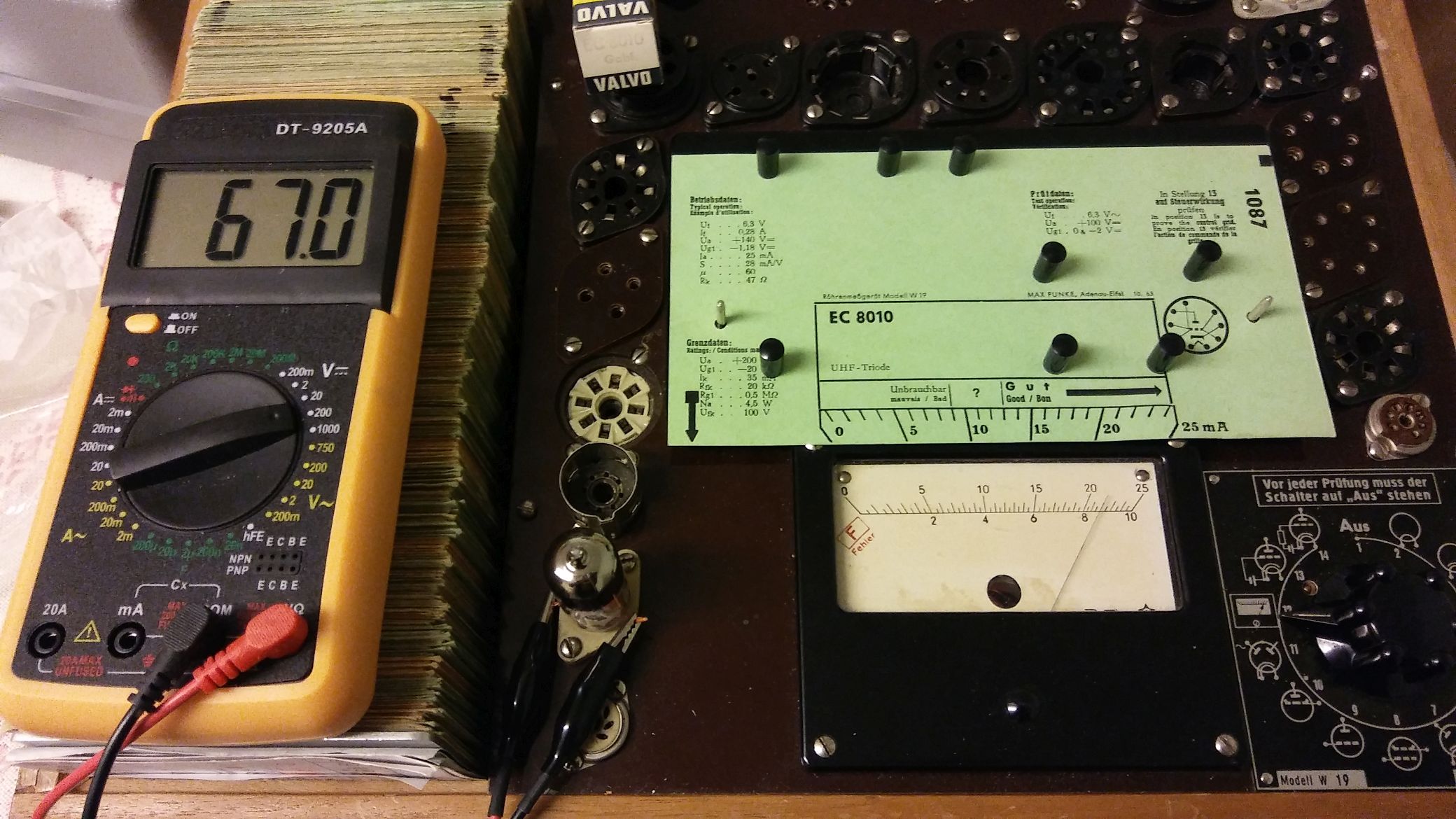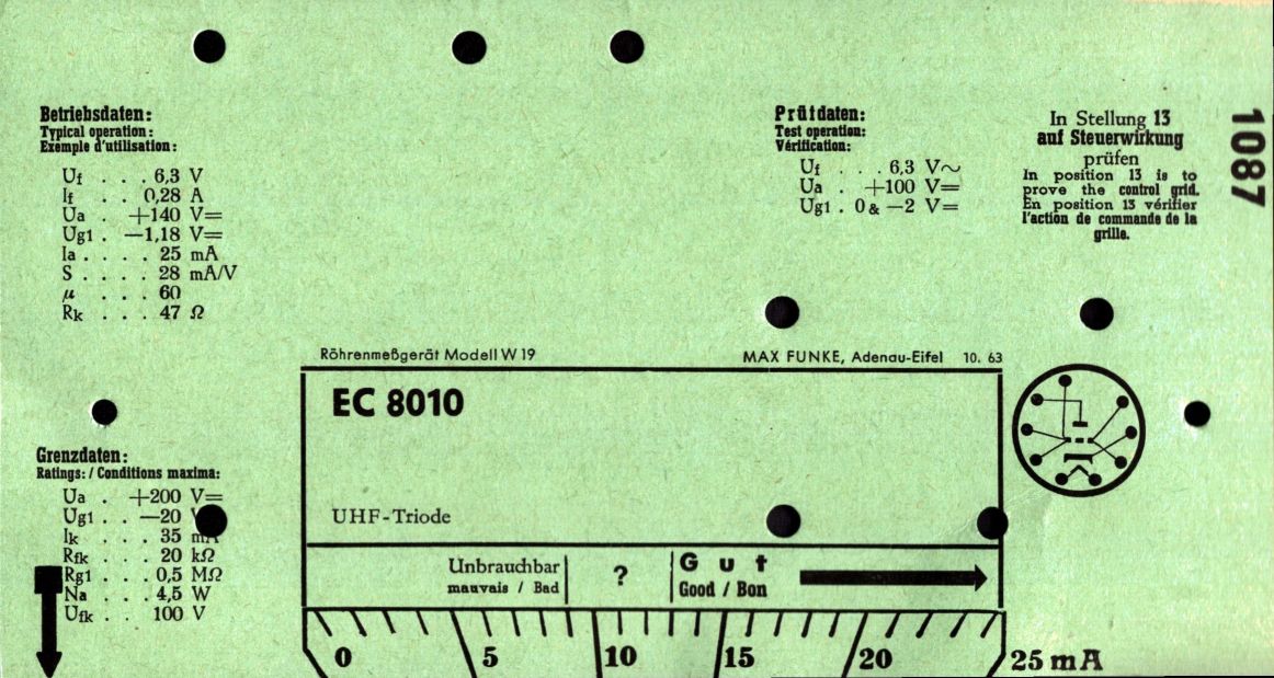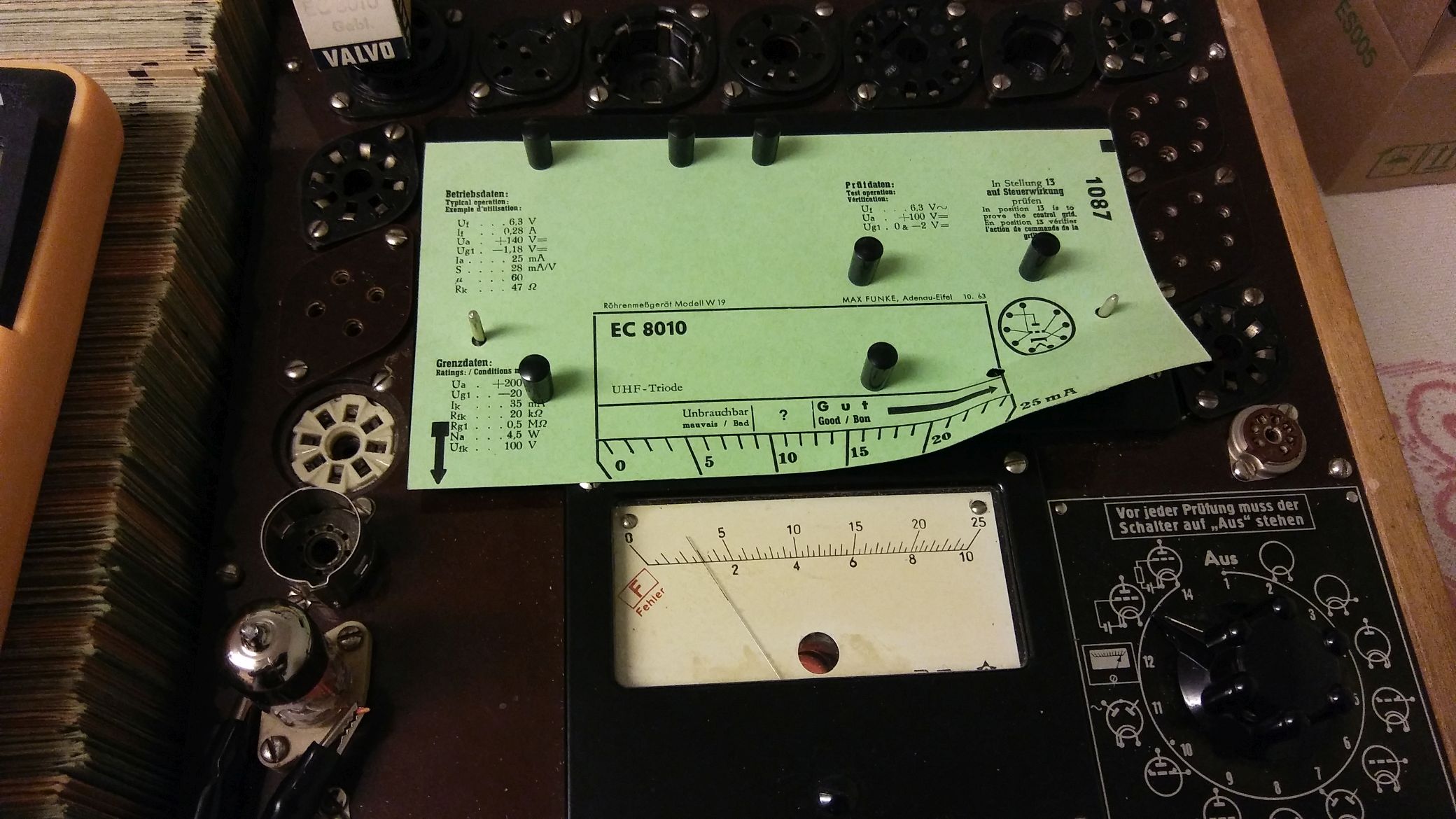 Ich habe die Röhre im Funke kurzzeitig mit 150 und 200 Volt belastet und bekam die Anzeige 50 und 80 mA. Es ist durchaus möglich, dass die Röhre ihre 10.000 Stunden schon gebrannt hat. Es war damals gängige Praxis, die Röhren nach genau einem Jahr auszutauschen, wenn sie im Dauerbetrieb waren.