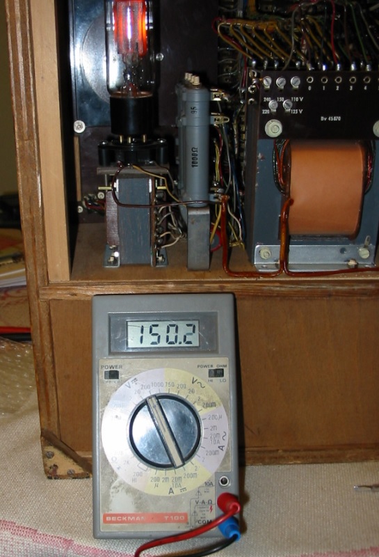 Wolfgang hat mit seinem Hinweis völlig Recht, dass das Gerät nur bei 150V einigermassen plausible Anodenströme anzeigt, allerdings sinkt die Spannung bei 30mA Belastung bereits um fast 10 Volt ab. Der Glimmstabi ist nicht ideal, auf ihm basieren aber die Prüfkarten, sodass eine Modifikation nicht sinnvoll erscheint.