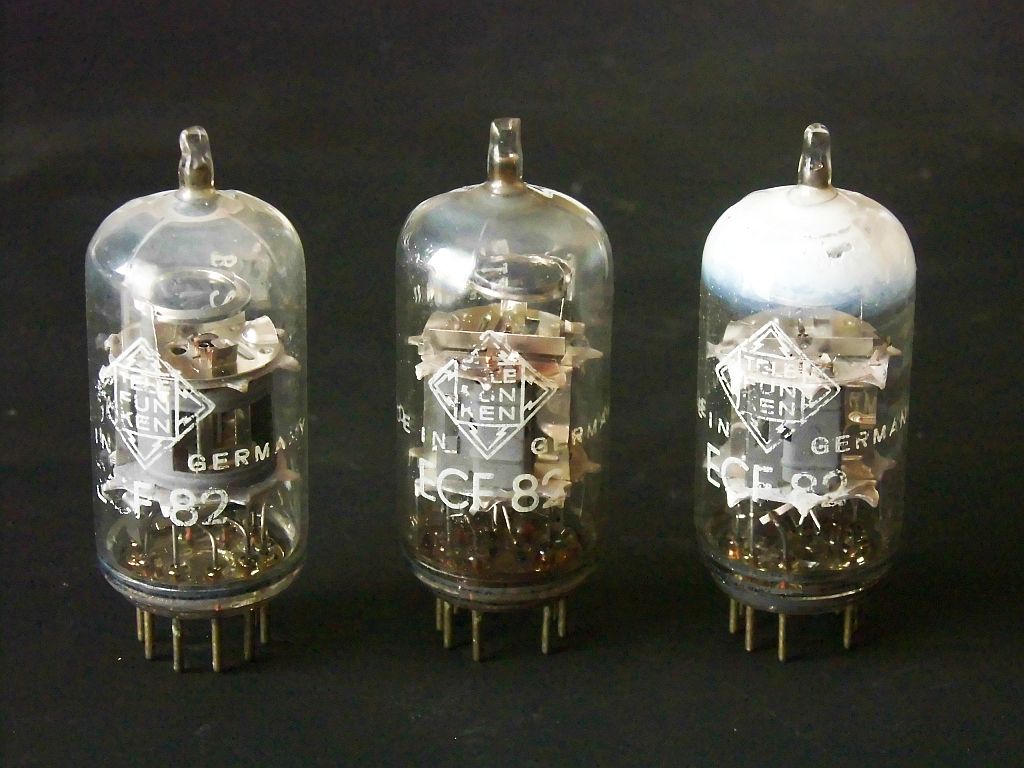 Ich habe hier drei ECF82 von TELEFUNKEN aus Berlin, mit den Kodierungen: B0106209 und B1206109. Man sieht sofort am Getter, die haben Luft gezogen, ob wohl die Glashüllen keinen auffallenden Schaden zeigen.