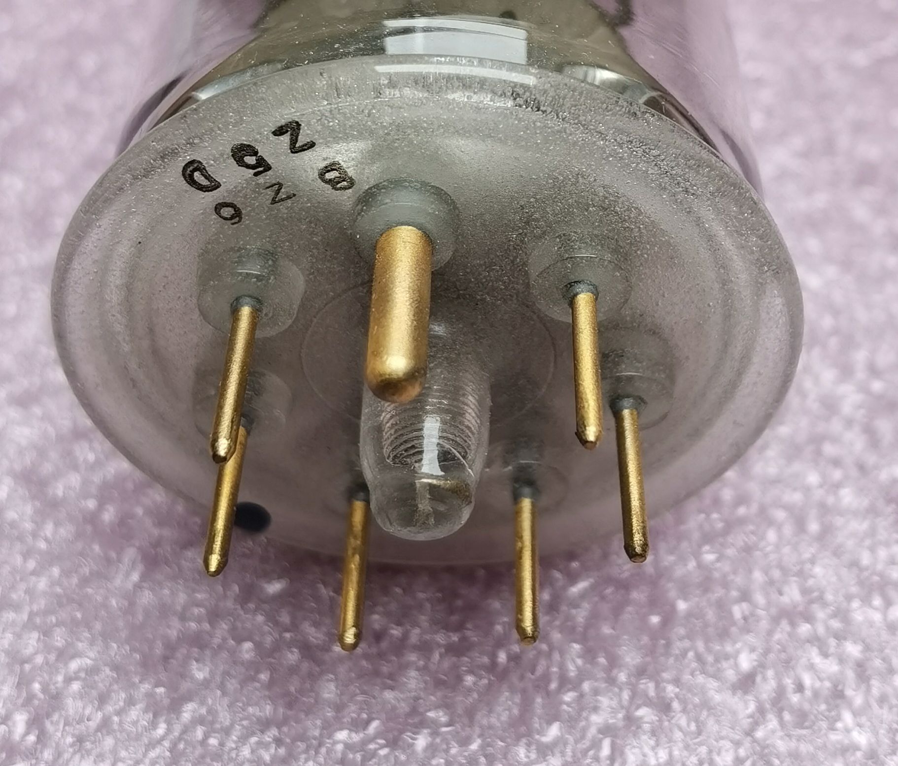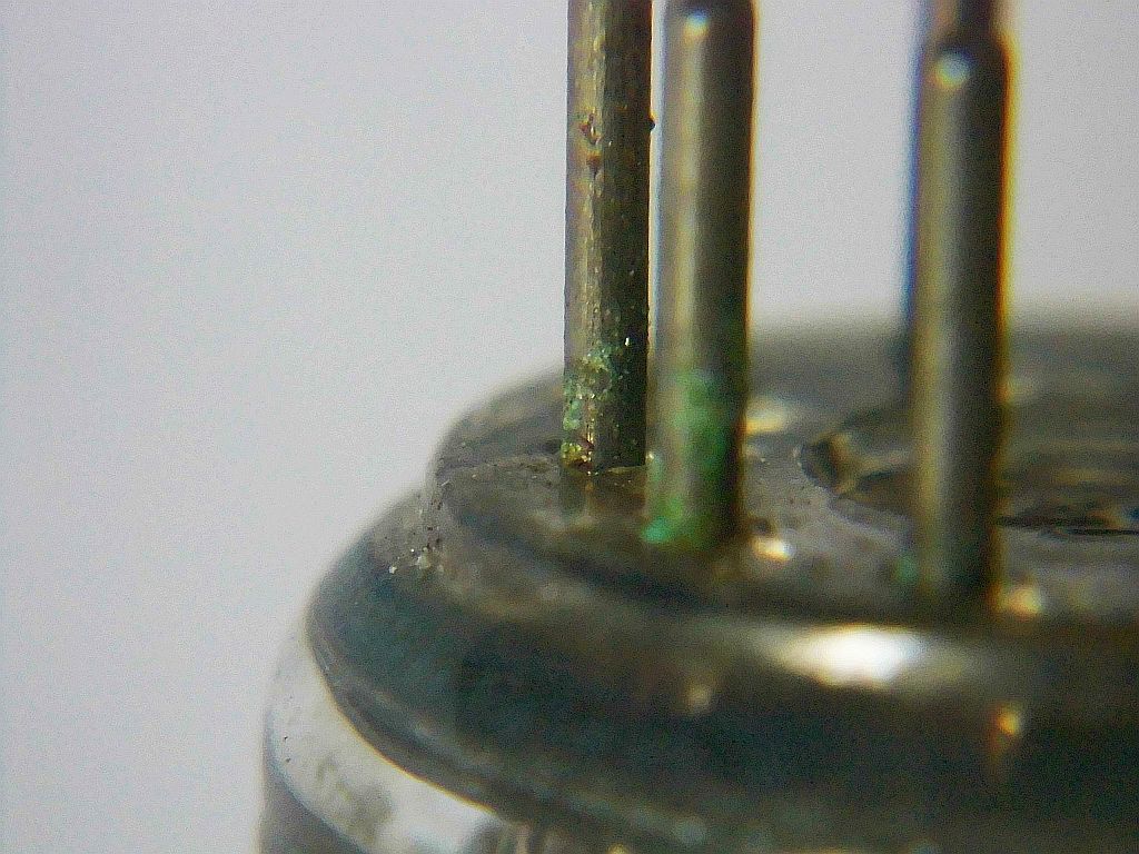 Mit der Lupe erkennt man an den Stiftdurchführungen KORROSION ! An diesen Stellen ist also die Röhre undicht geworden .....