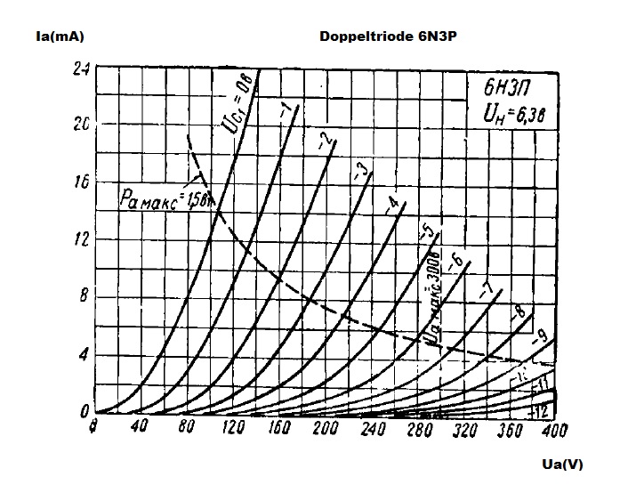 danke für den interessanten RM-Link. Mit dem "J" kann ich auch nichts anfangen. Für die 6N3P gibt es zum Vergleich folgende Kurvenschar, die ich vielleicht nächste Woche einmal nachmessen werde: