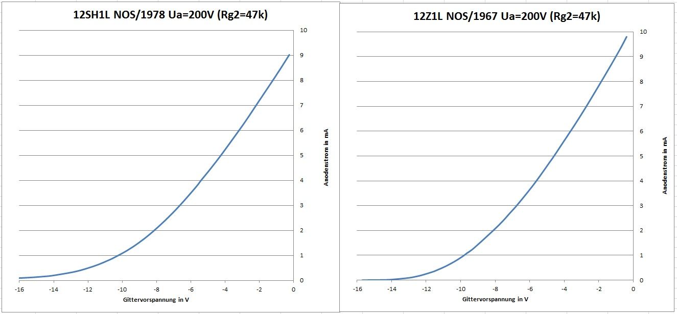 abschliessend habe ich die polnische Telam 12Ż1Ł (NOS, April 1967) der russischen 12Ж1Л gegenübergestellt. Erwartungsgemäss gibt es wenig Unterschiede. Im Kurvenverlauf kann man die polnische Röhre als "Mittel" zwischen der deutschen und russischen Röhre sehen. Für ihren Verwendungszweck werden alle drei Varianten ihren Dienst tun, auch wenn das Original mein Favorit ist.