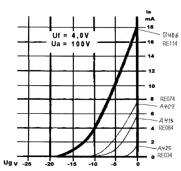 Ursprünglich wollte man (meiner Meinung nach) einen zu großen Typenbereich mit einer Ersatzröhre abdecken. Von der RE034 bis zur Endtriode RE114! Die Kennlinien zeigen jedoch, dass das schon vom Aussteuerbereich her unmöglich ist. Es muss also eine direkt geheizte Röhre gefunden werden, die wenigsten zwei Anforderungen befriedigen kann. Gemeint sind die RE074 und RE 084. Vielleicht -mit Enschränkungen- auch noch die RE034.