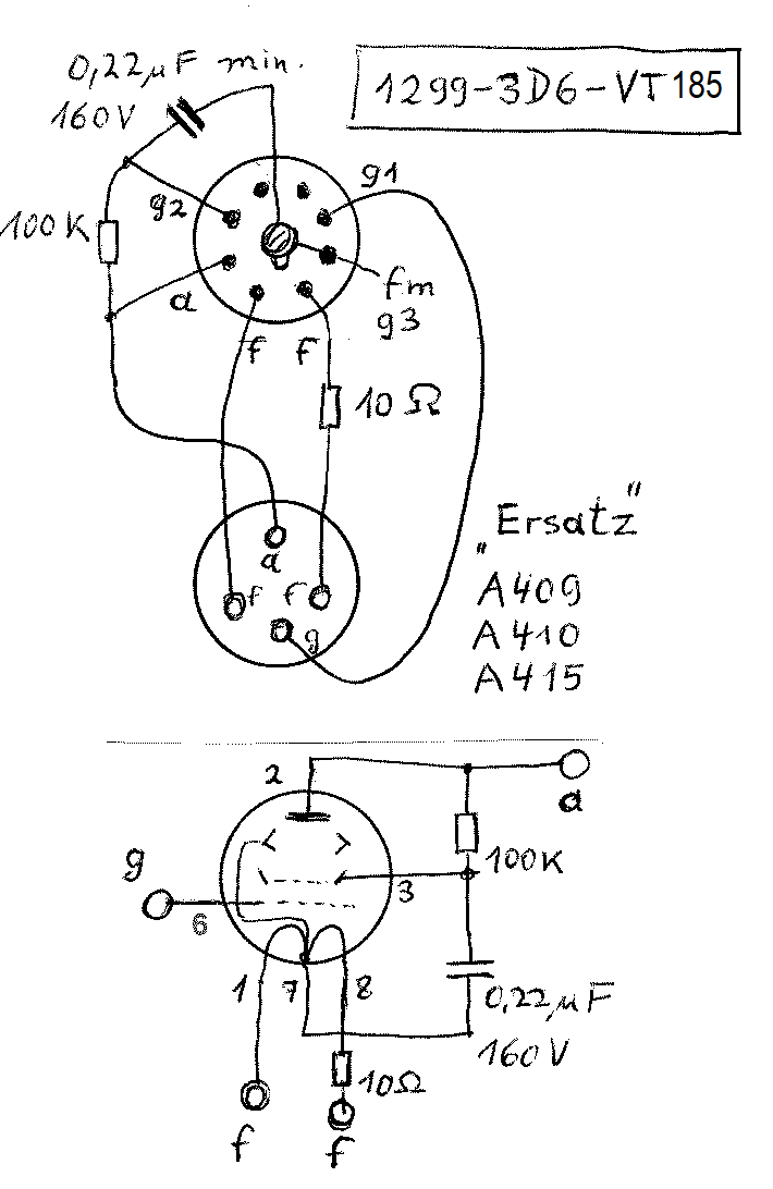 Nach langem Suchen hab' ich die amerikanische 1299 (3D6-VT185) gefunden, welche noch für wenig Geld im Handel ist. Das ist aber eine Pentode, wird man einwenden! Stimmt, und einfach das Schirmgitter mit der Anode verbinden funktioniert auch nicht, weil dann der Ia viel zu groß wird. Also wurde die Ug2 Spannung mit einem Widerstand reduziert. Um die starke Spannungsgegenkopplung unwirksam zu machen, wird die Ug2 mit einem ausreichend großen Kondensator stabilisiert. Das geht gut ab Frequenzen über 100Hz bei C = 0,22µF. Besser ist 0,47µF, wenn dieser unterzubringen ist. Hier erkennt man den Nachteil dieser Ersatzlösung: Das Anwendungsgebiet ist beschränkt auf die NF- oder HF-Verstärkung. Das Gleichstromverhalten ist gänzlich anders, d.h. nicht geeignet für Trioden verwendet als steuerbarer Widerstand in Regelschaltungen (ALR z.B.). Auch auf dem Röhrenprüfgerät werden nicht vergleichbare Werte angezeigt.