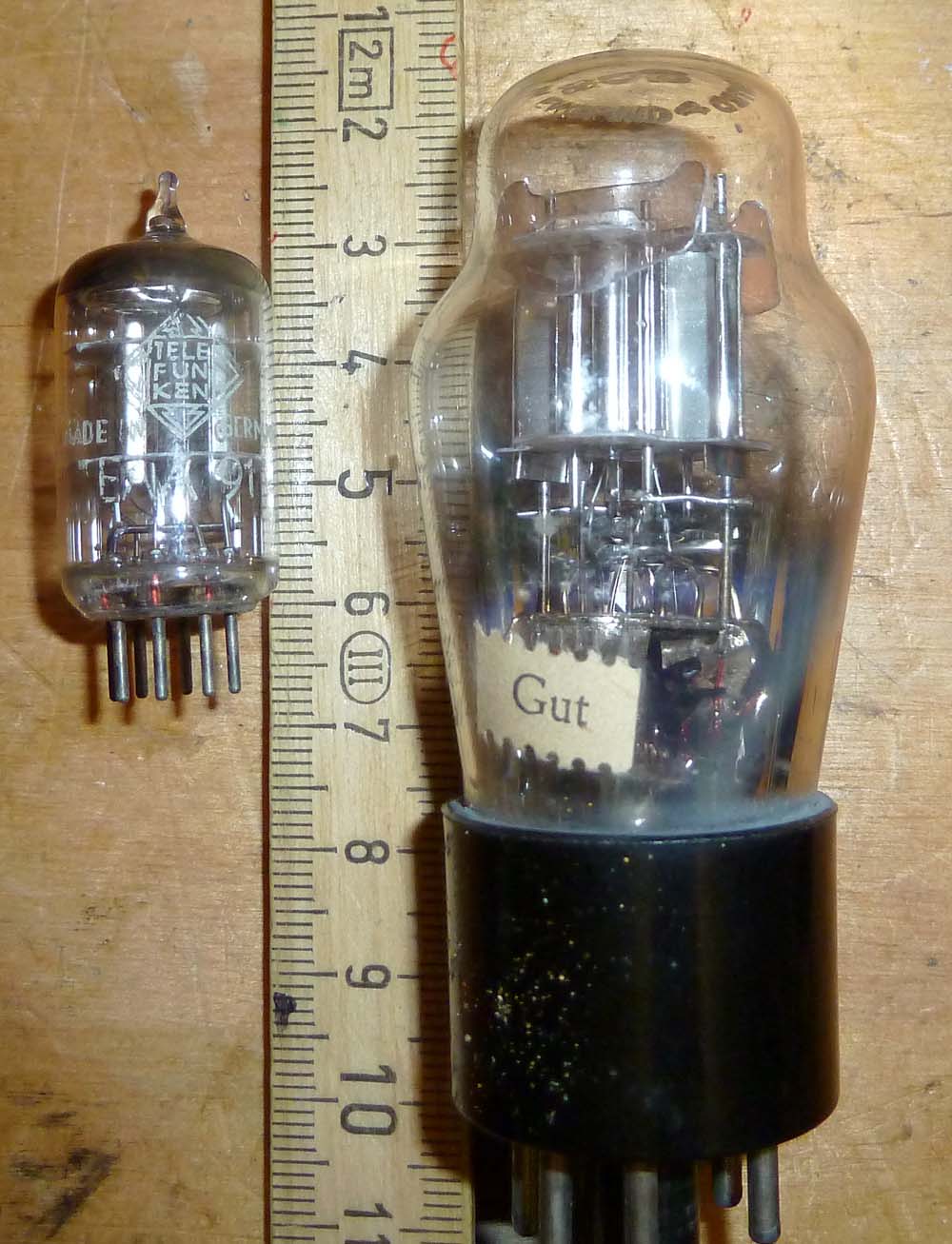 hier ein schöner Vergleich zweier Röhren mit identischer Funktion, die Doppel-Dioden (mit separaten Kathoden) D63 von Marconi (ca. 1935) und der EAA91 (ca. 1950, nennt sich teilweise auch EB91, obwohl das falsch ist, jede Diode hat seine eigene, nach aussen geführte Kathode).